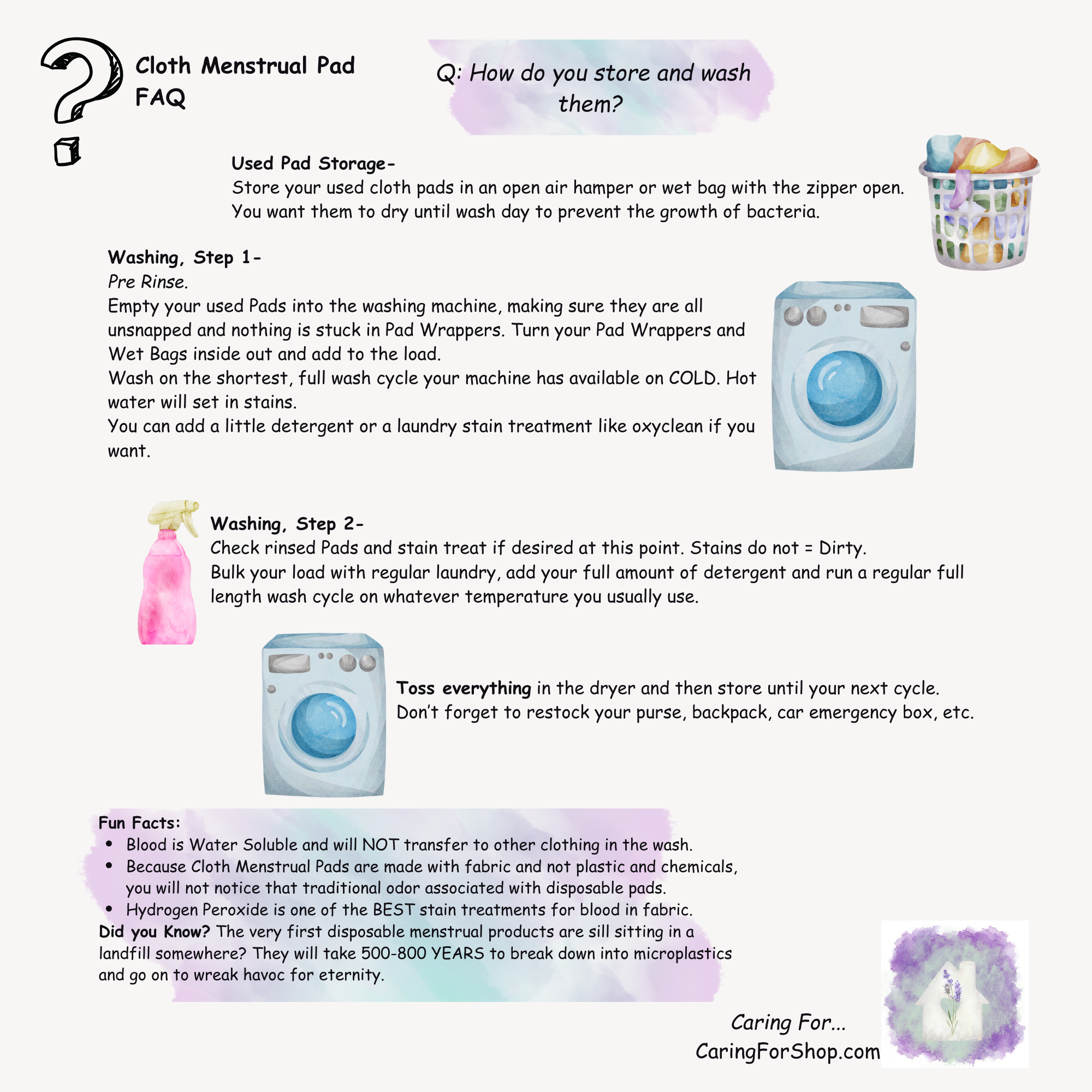 Do Not use Fabric Softener in the Washer or Dryer with your Cloth Pads.